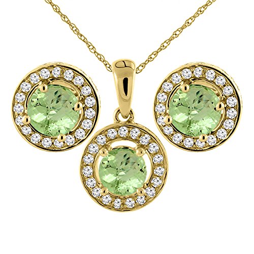 -. Title : 14K Yellow Gold Natural Peridot Earrings and Pendant Set with Diamond Halo Round 5 mm