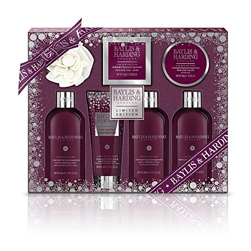 Baylis & Harding's Midnight Fig & Pomegranate Ultimate Bathing Gift Set contains an expertly crafted collection that provides an all over indulgent pampering experience. The seven different products each work together in perfect harmony with your skin to cleanse, refresh, revitalize and moisturize. Each is richly fragranced with sumptuous fig and juicy pomegranate enveloped with dark fruits and berries with a sweet caramel heart and includes Balancing Body Wash (300ml), Shower Creme (300ml), Bath Milk (300ml), Luxury Boxed Soap (150g), Bath Soak (100g) and Hand & Body Lotion (130ml). An EVA Body Polisher is also contained in the set to help the products last longer and give an exfoliating boost to bath time. This festive gift set is delivered in a stylish berry-toned box covered in sparkles and shimmer, which is sure to delight anyone who finds it under the tree on Christmas morning.Feature