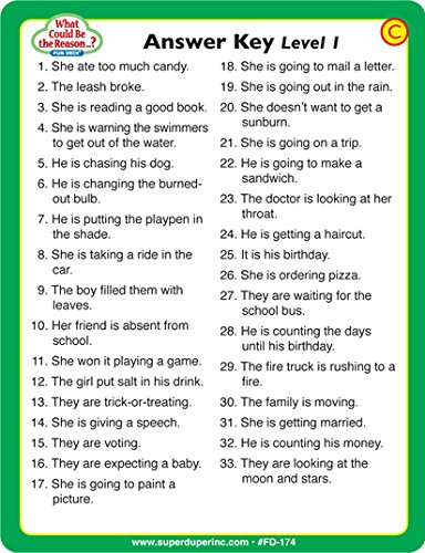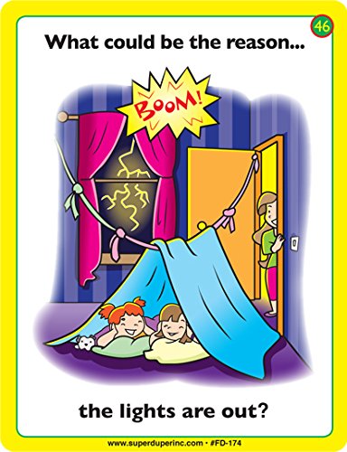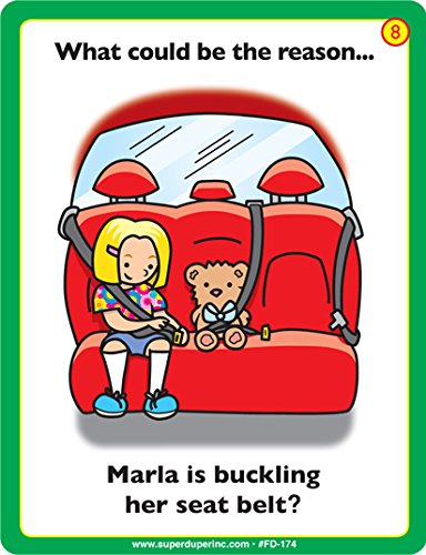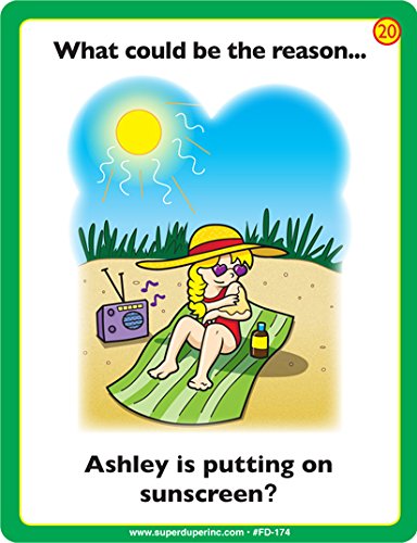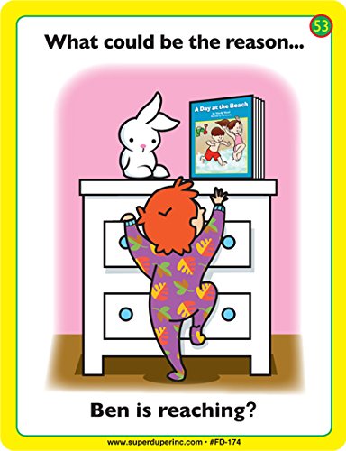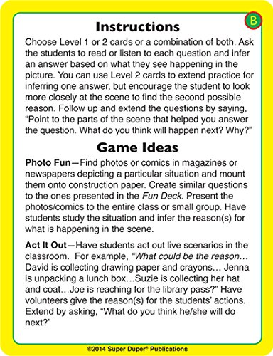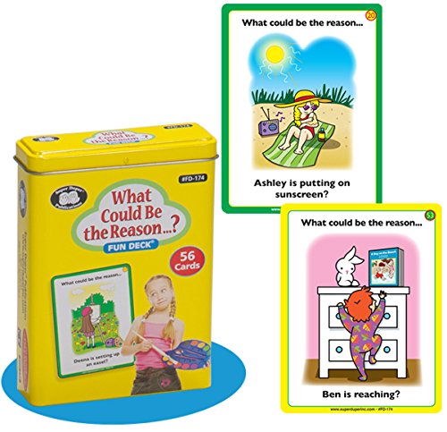 What Could Be the Reason...? Fun Deck presents 56 colorfully illustrated picture cards to help children practice and build reasoning and inferencing skills.After reading or listening to the question on the picture card, the child infers the answer(s) to the question by studying what is happening in the scene. There are two levels of cards. Level 1 cards (green) present one obvious answer to the question. Scenes in the Level 2 cards (yellow) have two possible answers.