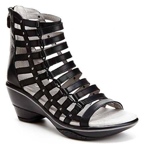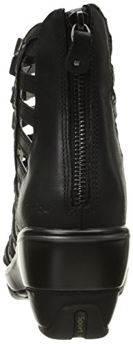 Wedge sandal featuring gladiator-inspired strappy upper with woven bungee cords and mini studs
