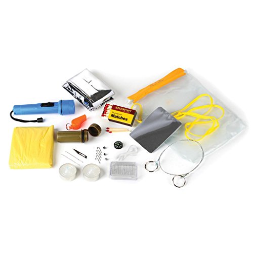 -. Feature : Heavy-gauge vinyl / Self-sealing Velcro top / Waterproof utility pouch with carrying cord / Carrying case / Heavy gauge vinyl, self sealing Velcro top, waterproof utility pouch with carrying cord / Emergency blanket, plastic match box, waterproof matches, compass, flashlight, whistle, mirror, candles, wire saw, fish hooks, lead sinkers, leader line, sewing needles and knife blade / Essential elements for emergency preparedness / Lightweight and compact to take anywhere / Perfect for hikers and campers