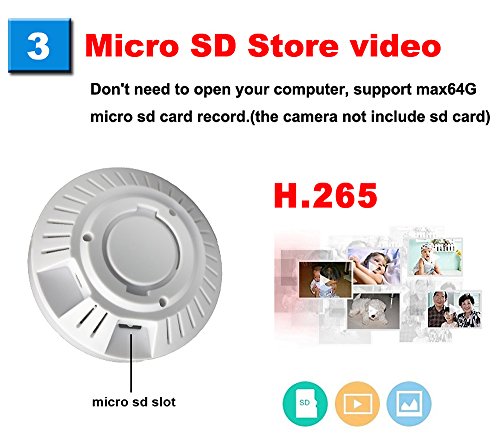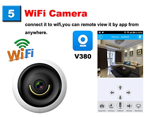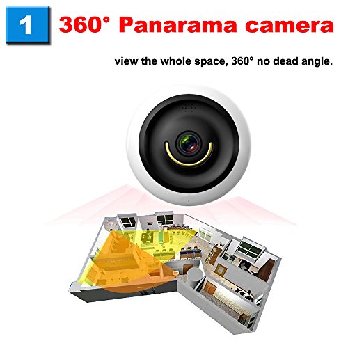 -. Feature : * PANORAMA 360 DEGREE WIDE ANGLE, Wi-Fi IP camera without blind spots. With 2.0Mp you can see the entire room in super HD video quality during the day or at night(with Night Vision). / * MOTION DETECTION, when something is moving in your room , The home camera motion detection sensors 'feel' it and will take a picture and push a message on your phone,watch the live video at any time any place,perfect for surveillance! / *BUILT-IN VOICE PICKUP ,the wifi camera can pick up the sound from 7m. / * WIFI CAMERA AND BABY MONITOR,connect the wifi you can remote view it by APP , it is very convenient to monitor the baby and take care the children in other room / *MICRO SD STORE VIDEO UP TO 64G, you donot need to open you computer ,support 64G micro SD card(not include),
