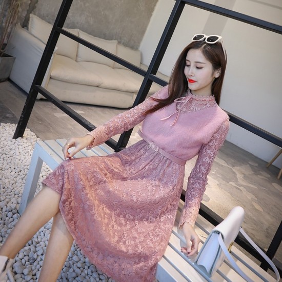 ワンピース レース ハイウエスト ミディ丈 長袖 ファー トレンド 可愛い 華やか キュート お出かけコーデ パーティー 二次会 drgz1567
