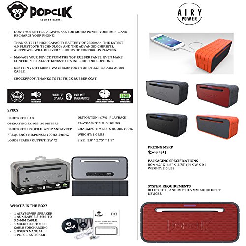 PopClik Speaker Airypower Bluetooth 4.0 Massive Bass 100 Foot Range 10 Hour of Continous Play Orange & Gray
