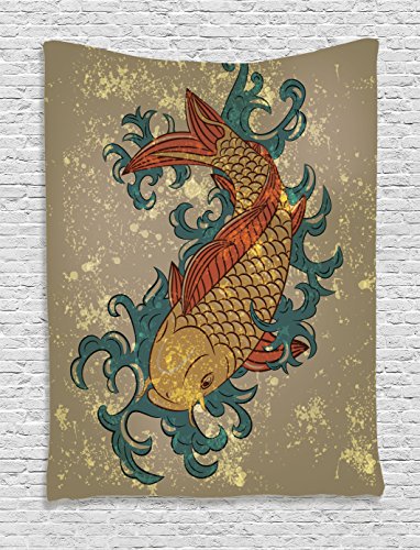 Japanese Decor Tapestry Wall Hanging by Ambesonne, Grunge Asian Style Oriental Cold Water Koi Carp Fish Aquatic Theme on Distressed Pattern, Bedroom Living Room Dorm Decor, 60WX80L Inches, Multi