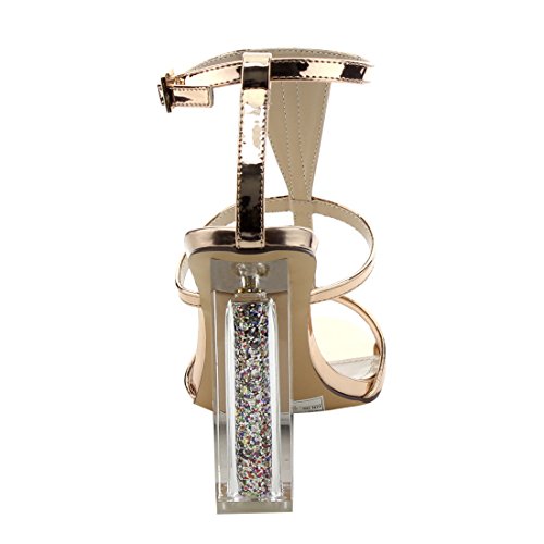 Product DescriptionShow your feet some love with these women's clear chunky heel ankle strap dress sandals.Designed with adjustable buckle closure,open-toe silhouette,stiching details.0