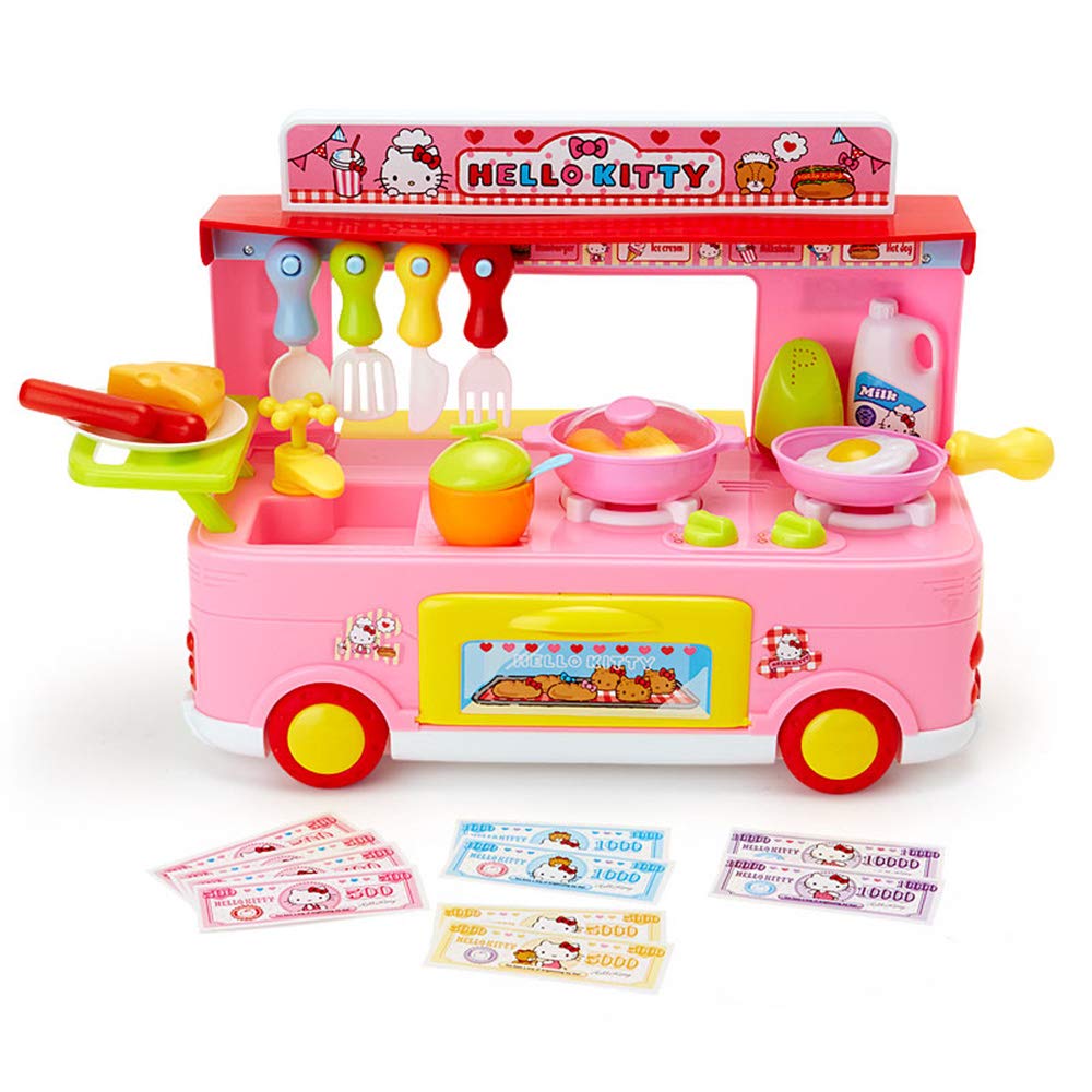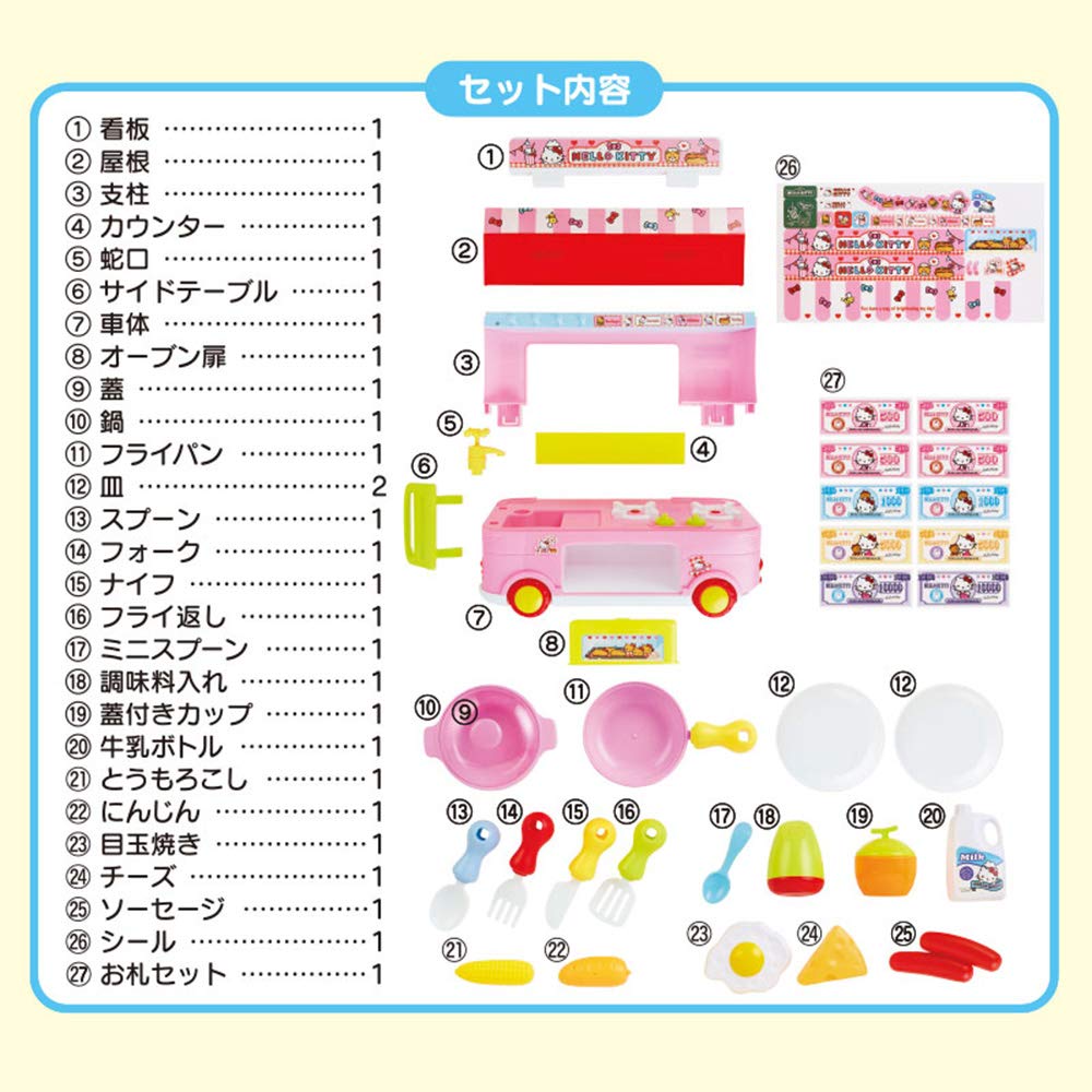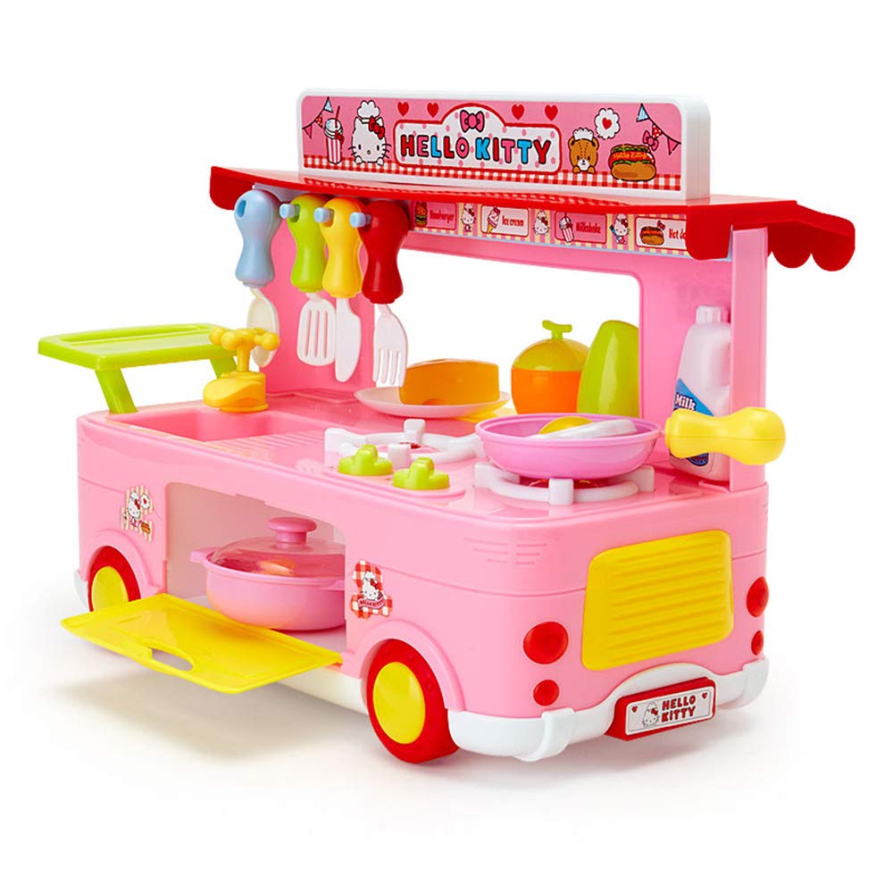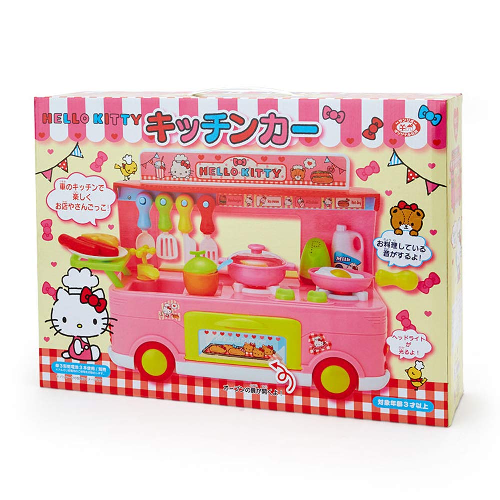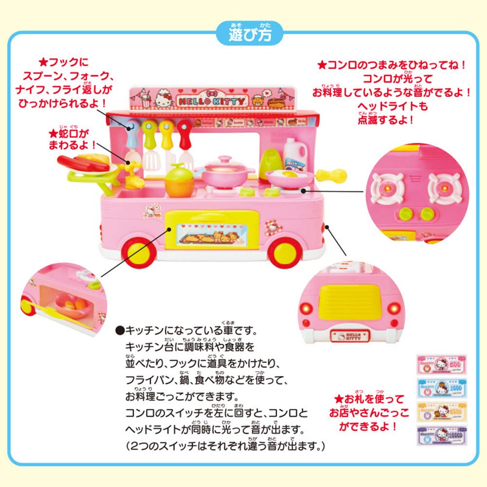 ごっこ遊びにワクワク夢中になるおもちゃ。コンロのつまみを回すと、音が出たりライトが光る楽しい仕様。プレゼントにしたら最高の笑顔が見られそう。本体サイズ:パッケージ:約47.5×12×34cm。主な材料・原料:ポリプロピレン、ABS樹脂、ポリスチレン、ポリエチレン、紙。キッチンになっている車です。向かい合って遊べます。キッチン台に調味料や食器を並べたり、フックに道具をかけたり、フライパン、鍋、食べ物などを使ってお料理ごっこが出来ます。コンロのつまみを左に回すと、コンロとヘッドライトが同時に光って音が出ます(2つのスイッチはそれぞれ違う音が出ます。)。お札を使ってお店屋さんごっこも出来ます。対象年齢3才以上。単3形乾電池3本使用(別売)。(C)1976,2018 SANRIO CO.,LTD.(P)