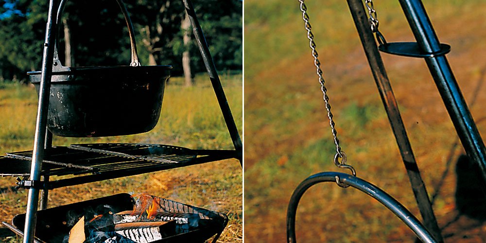 Lower the cooker and the large pan to the up and down adjustable chain hook and adjust the fire reduction.
