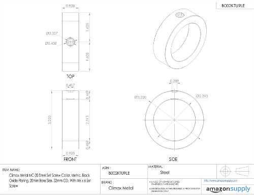 Climax Metal MC-20 Steel Set Screw Collar, Metric, Black Oxide Plating, 20mm Bore Size, 32mm OD, With M6 x 6 Set Screw