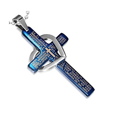 -. Title : Stainless Steel Black Blue Cross Love Heart Lord's Prayer Pardre Nuestro Spanish Pendant Necklace, 18"