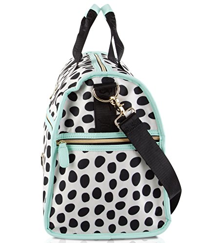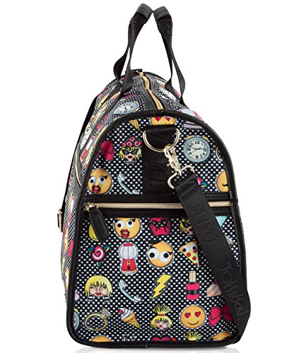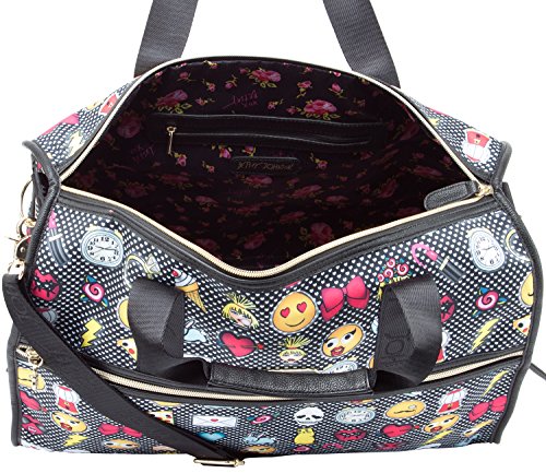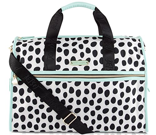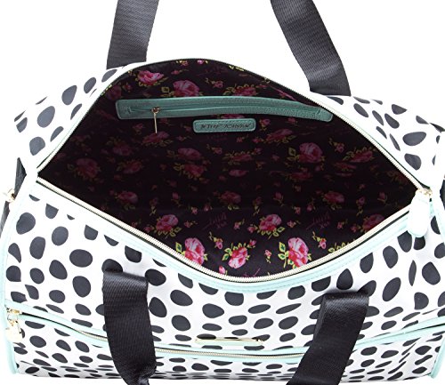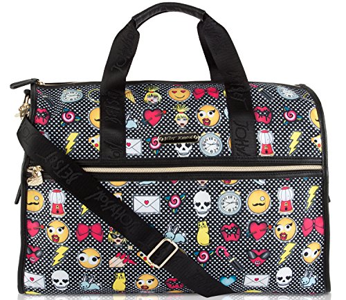Product Description Hit the road in style with these uniquely designed lightweight duffel bags from Betsey Johnson, Featuring Fun all over printed exterior, a zipper closure and spacious interior sized-right for last minute getaways, dual carrying handles with a drop of 3" inches, and a Removable adjustable strap for easy carrying, Fully Lined interior, with a back wall zipper pocket and 2 slip pockets. It's the perfect addition to your everyday adventures. Can be used as a gym bag or a small overnighter 0