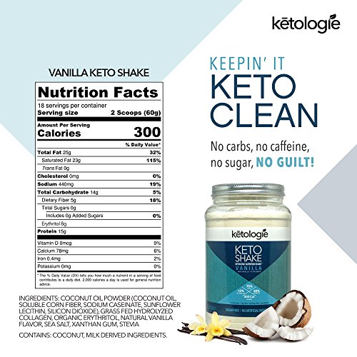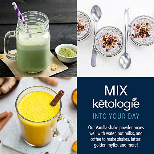"I'm a lazy keto dieter I'll admit it, I like the simple stuff. So when I saw they had a keto meal replacement shake, I instantly had to try it. I bought the vanilla and omg amazing! It tastes fantastic! I'm definitely buying it again!" | "I really enjoyed this. I mix it with my coffee and it's awesome help to keep me in keto with great taste!" It doesn't matter how long you've been on the Ketogenic diet - there is one thing we all have in common: we want to be IN ketosis, not spend every waking moment thinking about it. That's why we developed the Ketologie® Vanilla Keto Shake. Our mission is to keep you moving toward your health goals without worrying about how to get in - and stay in - ketosis. To stay true to this, we have done all the macronutrient calculations for you. Our shakes contain 75% fat, 20% protein, and less than 2% net carbs. Our special blend keeps you 'keto clean' and features coconut oil, grass fed bovine collagen protein, sea salt and never any caffeine, sugar or guilt! Whether you blend our vanilla shake mix with water, nut milks, or coffee, the result is a creamy and delicious treat that tastes like a cheat meal. Not in the mood for a shake? Use your keto shake powder to blend up a delicious matcha tea latte, golden mylk, or even a breakfast chia pudding! At Ketologie®, we believe you shouldn't have to sacrifice flavor in order to maintain your ketogenic lifestyle. Looking to stay keto on-the-go? Our Vanilla protein shake powder fits easily into a gym bag or purse for a convenient pick-me-up after an intense workout, a mid-day energy boosting snack, or a full meal replacement during that seemingly endless business meeting. Wherever you go, Ketologie® easily mixes into your day. Order your Ketologie® Vanilla keto shake mix today, and experience enhanced mental clarity, increased athletic endurance, and a lifestyle change that may aid in weight loss. Go ahead- Eat with your mind open! 0 |