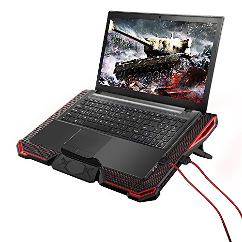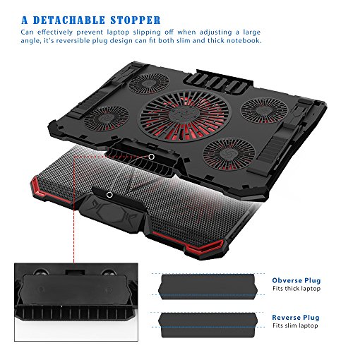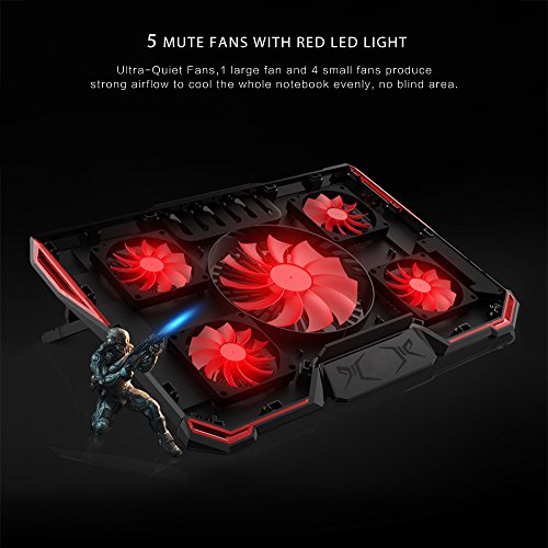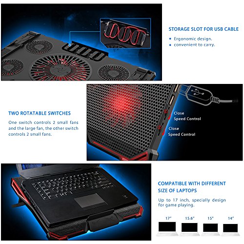 -. Feature : 5 STRONG QUIET FANS: 5 built-in strong quiet fans with LEDs. Reduce the trouble of computer fever,Compatible with 12-17 inches laptop. / ERGONOMIC DESIGN: Seven adjustable height setting, comfortable for natural point of view. A detachable stopper can effectively prevent laptop slipping off when adjusting a large angle. / ADJUSTABLE FAN SPEED CONTROLLER: Two rotatable switches can control 5 fans and LEDs simultaneously. / 2 USB PORTS: Built-in two USB ports allow to charge for a phone, tablet, MP3, etc. While one USB port supplies power to the cooling pad. / OUR GUARANTEE: If you have any problem about our product, please contact our customer service and we will do our best to make you satisfied.