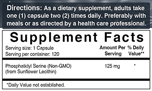 -. Feature : Soy-free Phostidylserine 125 mg per capsule. Maximum strength. / Promotes cognitive health and enhances brain function. / Nourishes brain cell membranes and helps maintain mental sharpness. / Non-GMO. Soy free. Gluten free. Dairy free. Sugar free.Tree nut free. / Manufactured in California in FDA registered facility. 1 Year unconditional money back guarantee.