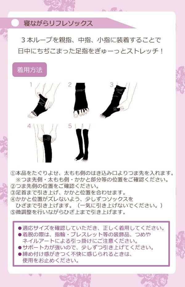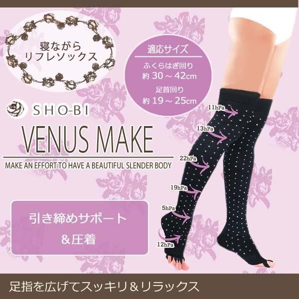 引き締めサポート&圧着が疲れた脚を癒してくれる!足指を広げてスッキリ&リラックス。 製造国:中国 素材・材質:ナイロン、アクリル、ポリウレタン、ポリエステル 商品サイズ:ふくらはぎ周り:約30~42cm、足首周り:約19~25cm 仕様:洗濯機洗い可 ※サプライヤー直送品 ご注文後2~3営業日後の出荷となります【商品名】SHO-BI ビーナスメイク 寝ながらリフレソックス