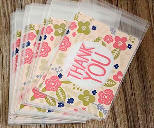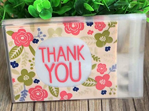 Yunko 100pcs Pink Flower Thank YOU Cookie Packaging Self-adhesive Plastic Bags for Biscuits Package Good for Bakery Party Cz024
