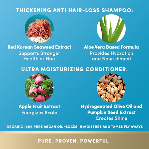 The Pro Organic Shampoo and Pro Organic Conditioner both use 100% organic Aloe Vera juice as a base. While shampoos tend to be H2O based, we've replaced regular water with a natural plant that's known to increase follicle health. The Pro Organic advantage means that every ounce of our shampoo is working to maintain your hair. Our exclusive concentrated formula fortifies thinning hair and provides maximum hydration for healthier, stronger hair with 15 DHT Blockers. Clinically proven blend of Red Korean Seaweed, He Shou Wu and other premium organic essential oils penetrate and nourish hair follicles, increasing volume and strengthening strands.Feature