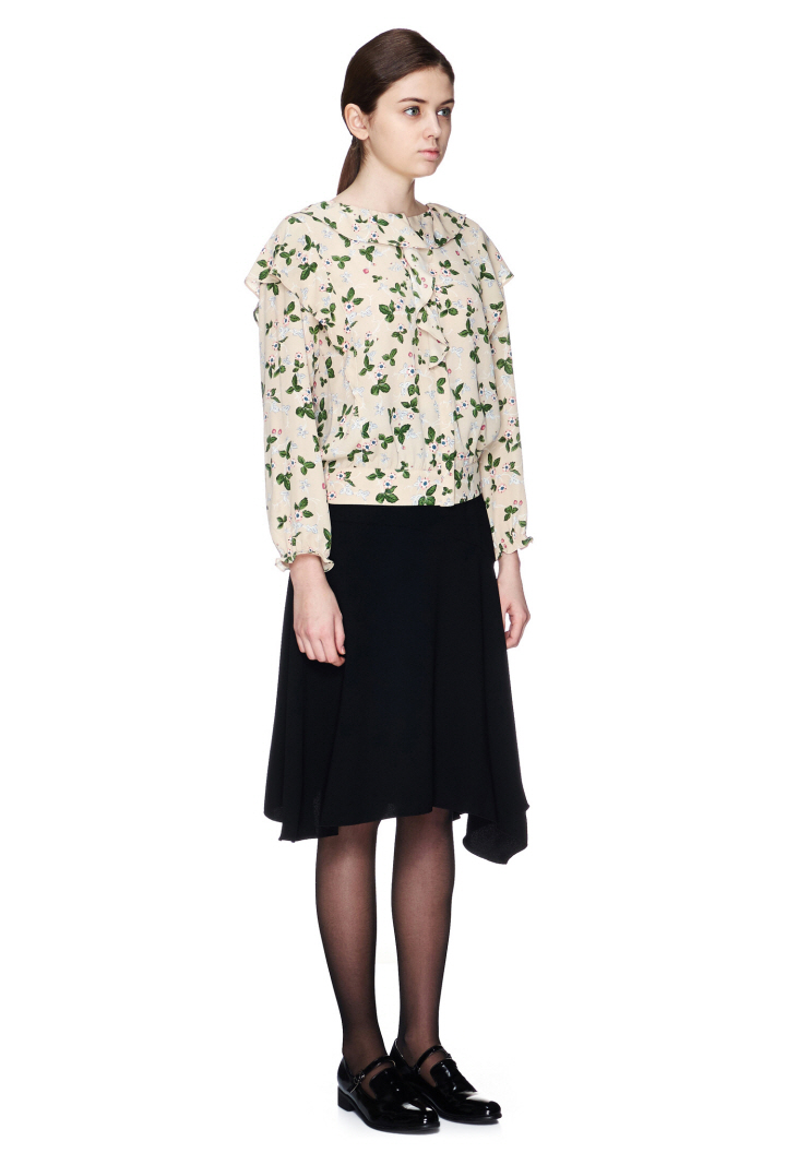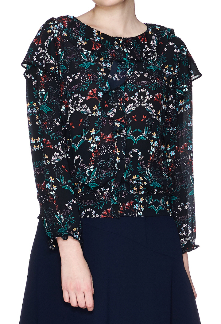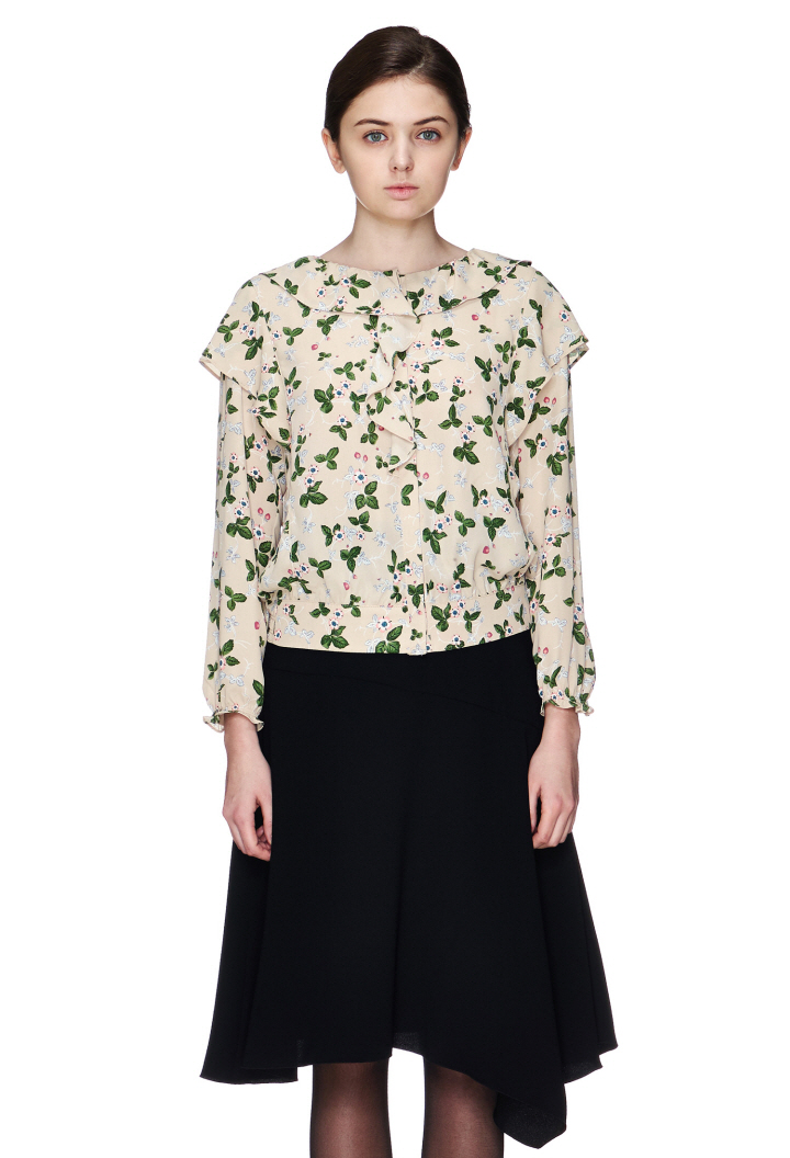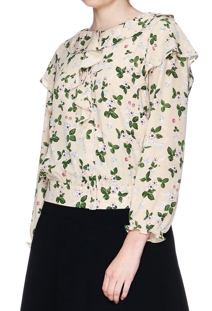 독특한 플라워 패턴에 숄더라인 프릴디자인이 포인트인 블라우스입니다