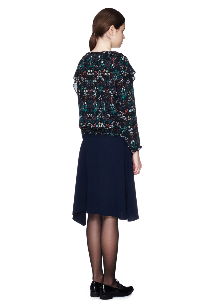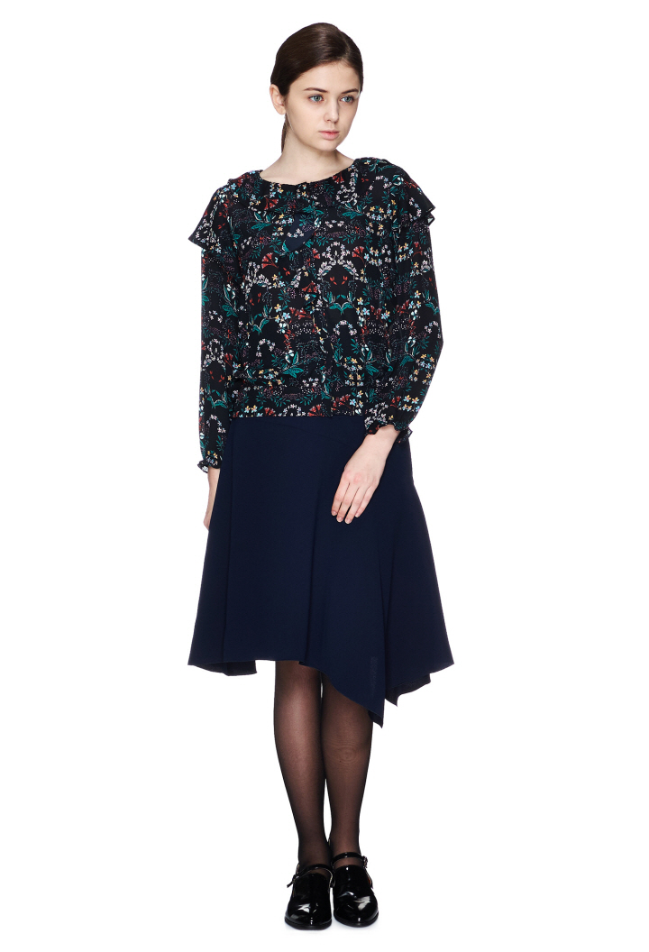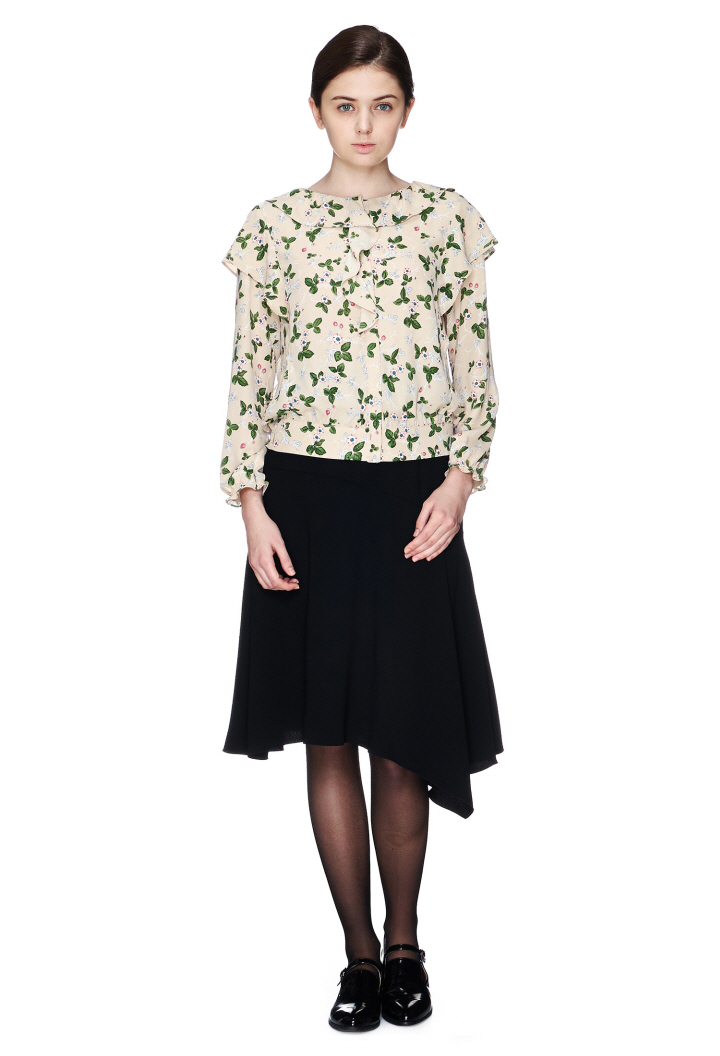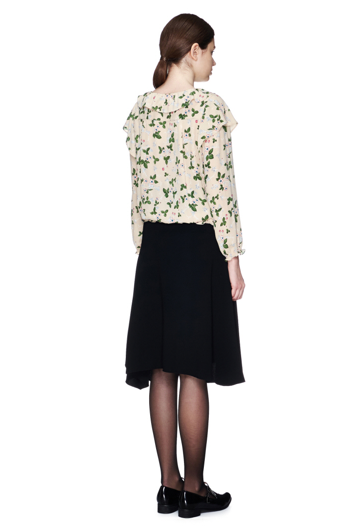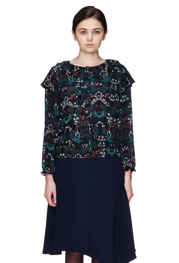 독특한 플라워 패턴에 숄더라인 프릴디자인이 포인트인 블라우스입니다