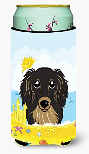 Caroline's Treasures BB2081TBC "Longhair Black and Tan Dachshund Summer Beach" Tall Boy Hugger Koozie, Multicolor