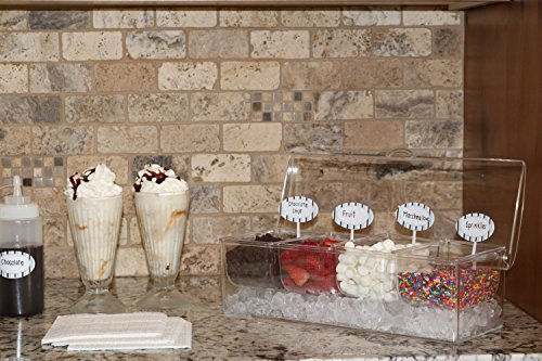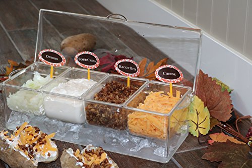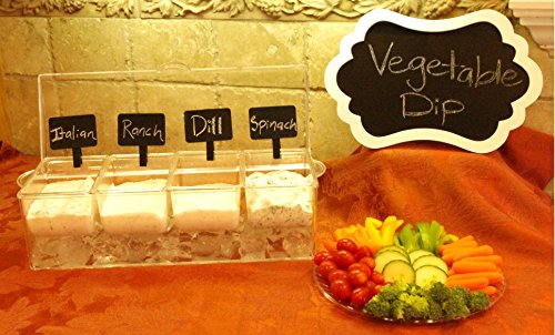 SERVING BAR WITH REMOVABLE COMPARTMENTS can be used to make all sorts of party dips and plates: vegetable dips, salsa bar, ice cream toppings, taco bar, burger and hot dog station, fruit dips, and much more!