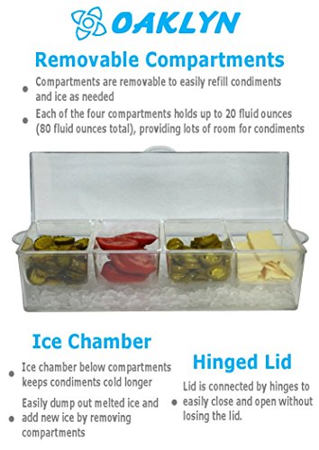 COMPARTMENTS ARE REMOVABLE so you can easily refill your condiments when they are running low and also refill the ice as necessary. EACH COMPARTMENT HOLDS UP TO 20 OUNCES for a total of 80 ounces.