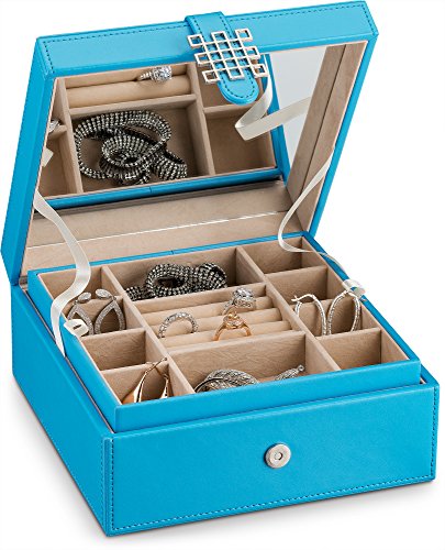 -. Feature : ORIGINAL GLENOR CO JEWELRY BOX: This is an ORIGINAL jewelry box that was designed and Trademarked by Glenor Co. Only the HIGHEST QUALITY products and craftsmanship were used to create this box. BEWARE of illegal knockoffs that are of far lesser quality and construction. / 17 UNIQUE COMPARTMENTS - Glenor Co Jewelry Box has compartments of various sizes and shapes to keep all types of jewelry separate, organized and neatly displayed. The compartments hold necklaces, bracelets, rings, earrings, watches, etc. OVERALL DIMENSIONS: 7 ½" x 7 ½" x 3¼ ". / UNIQUE,CONVENIENT & ATTRACTIVE DESIGN - Glenor Co. Jewelry Box boasts a unique , beautiful and a more convenient design than the other jewelry boxes out there. Our talented team of designers have worked hard to produce the perfect balance of modern, sophistication, beauty and class to create this unique box with its gorgeous large mirror and attractive metal buckle. Unlike others our box possesses a magnetic snap that can be easily opened and closed with one hand for the most convenient use. / FREE GIFT BOX & GREETING CARD - An elegant gift box and blank greeting card is included with each jewelry box for the most presentable gift giving. This makes a great gift for a mother, girlfriend , wife, daughter, colleague, friend or any other special woman in your life. / WE SPOIL OUR CUSTOMERS! Buy it Risk-Free. We will do everything we can to ensure you are COMPLETELY satisfied with your purchase. Refunds, exchanges and all. You are Guaranteed to be happy