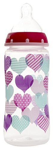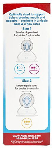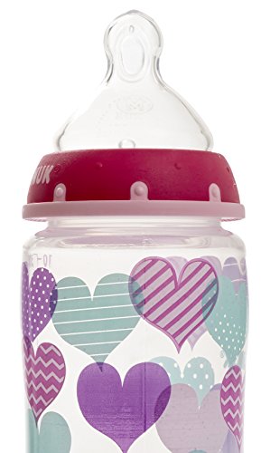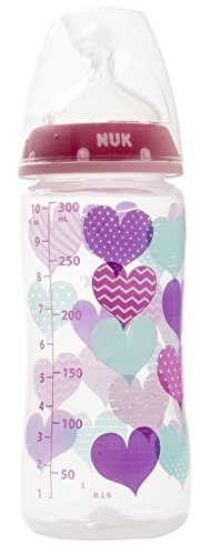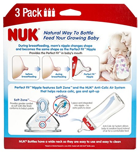 Perfect Fit nipples are optimally sized to support baby's growing mouth and appetite, available in 2 nipple sizes and 3 flow rates. The wide bottles are easy to use, clean, and assemble and are dishwasher safe. For best results when feeding, make sure that the NUK Anti-Colic Air System symbol is under baby's nose so that the unique drinking hole on top side is positioned correctly. NUK bottles are BPA Free and come with slow flow silicone nipples. Available in adorable hearts design. The NUK family of brands designs safe and fun products that encourage your baby's development. NUK is committed to nurturing your children's healthy transitions from birth to toddler and has worked for over 50 years to design high quality, innovative products that are scientifically proven to support safe and healthy development.