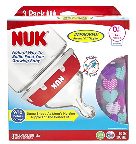 NUK ORTHODONTIC PERFECT FIT NIPPLE WIDE NECK BOTTLE, HEARTS, 10OZ, 3 COUNT
