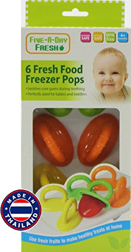 Studio : Regal Baby Publisher : Regal Baby Binding : Baby Product Product Description Five-A-Day 6 Fresh Food Freezer Pops with Easy Grip Handles, Drip Guard and Tray is Perfect for Creating Healthy Treats at Home! Colors Include Green, Orange Yellow Pop Molds with a White Tray. A perfect way to make healthy freezer pop treats for your baby! Ideal for freezing fresh fruit purees, fresh juice or yogurt into pops! Perfectly sized for babies and toddlers.....Soothes sore gums during teething too. Features easy to hold handles for babies and toddlers, as well as a drip guard to prevent messes. For Ages 6 Months - BPA-Free - Phthalate Safe - Dishwasher Safe (Top Rack Only) 0