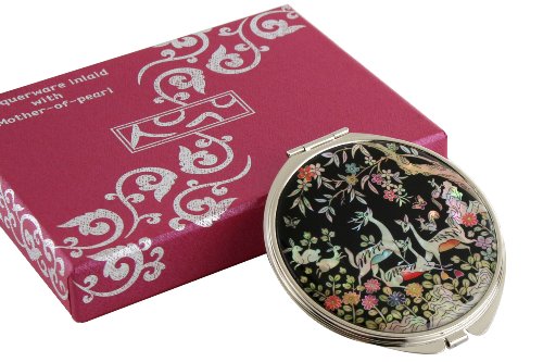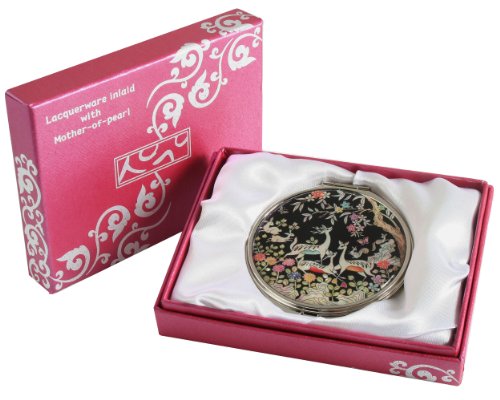Handmade Handcrafted Mother of Pearl Magnifying Double Compact Cosmetic Makeup Round Hand Mirror lacquer wares inlaid with Deer Design