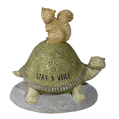- Cute turtle and squirrel figure with whimsical inscription that reads. "stay a while"
