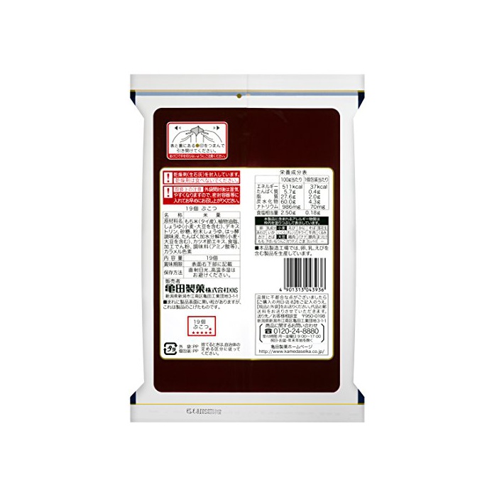 원재료:찹쌀,식물성 기름지,간장(밀 대두를 포함한다)고, 덱스트린,설탕,분말 간장,겨 효조미액,담백 가수분해물(밀 대두를 포함한다)고, 가다랭이절 엑기스,식염,조미료(아미노산등)고, 카라멜 색소