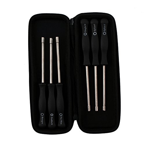 The set contains 6 different screwdrivers: a 7-Teeth Splined /21-Teeth Splined / Pac Man / Single D / Double D / Hexagon screwdriver.