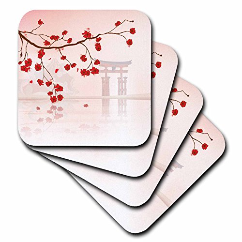 3dRose cst_116168_3 Beautiful Japanese Sakura Red Cherry Blossoms Branching Reflecting Over Water Oriental Vector Design Ceramic Tile Coasters, (Set of 4)