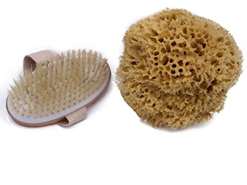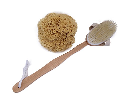 - 2 Item Bundle of Wool Sea Sponge (5-6 inches) and Back and Body Brush with 16.5 inch Detachable Long Wooden Handle