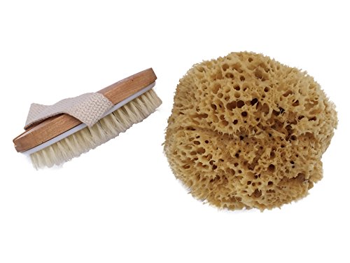Wool Sea Sponge and Body Brush – 2 Item Bundle of 5”-6” Natural Wool Sea Sponge for Bathing and Showering, and a Long Handed Back and Body Brush with...
