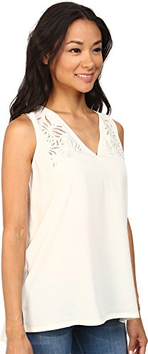 This sleeveless blouse as delicate cut out details at the shoulders and mixed media fabrics