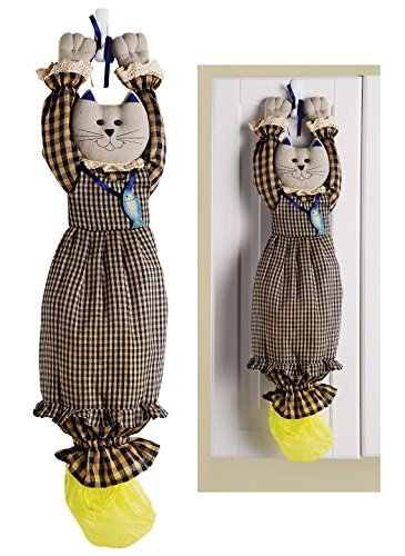 -. Feature : This country-style kitty stores plastic bags neatly in her gingham dress and dispenses them one by one for your convenience. / Keep your kitchen clutter-free and organized. / Easily hangs anywhere with attached blue ribbon. / Polyester. / 24"L.