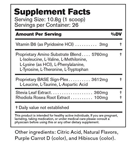 BASE Amino Performance and Recovery Mixed Berry Give your muscles the tools they need to be at the top of their game with the Amino Performance and Recovery from BASE Performance with Base Amino™.This formula will give have a noticeable effect on your performance, recovery and results, and has a total combination of 10 essential amino acids (EAA) produced naturally by your body and Branched-chain amino acids (BCAA) which come from diet and supplements. Because your amino acids play an essential role in muscle metabolism and protein production, it's important to make sure your body is getting everything it needs. Available in mixed berry. Features: Active ingredients - BCAA Amino Acids (Leucine, Isoleucine & Valine), Taurine, Aspartic Acid, Methionine, Lysine, Threonine, Phenylalanine, Trptophan, Arginine & Rhodiola Rosea Improved performance & enhanced recovery Increase or maintain lean muscle Aids muscle protein synthesis Stablized glycogen levels Reduced fatigue Aid in fat burning 26 Servings per container Serving size - 1 scoop or 10.8gFeature