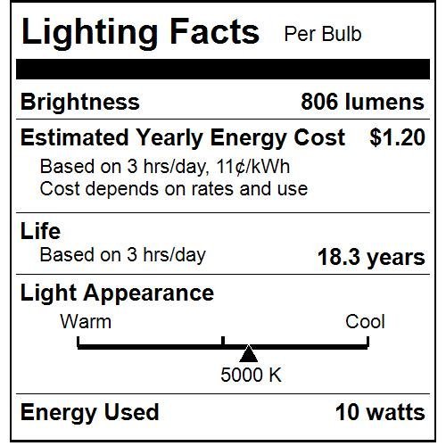 This general use light bulb generates a 220 degree dome of 5000K Super White light at 806 lumens
