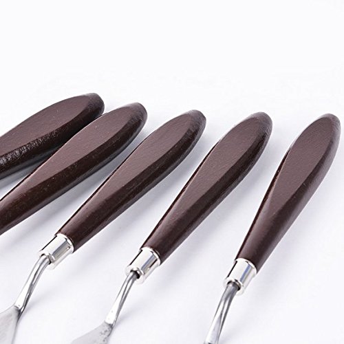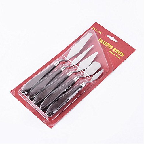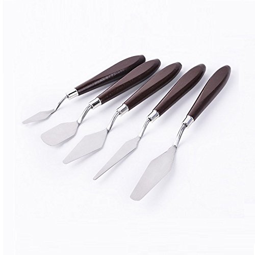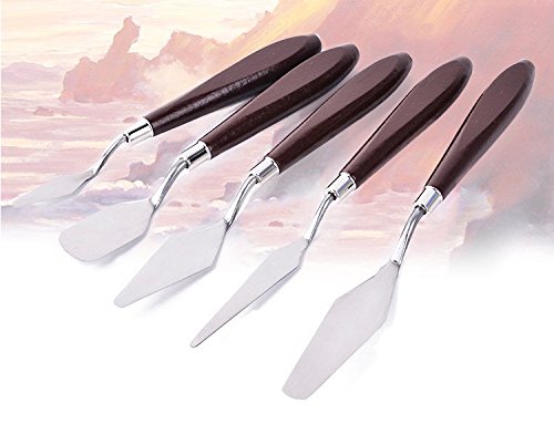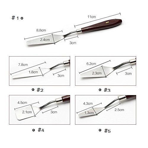 These individual 5 art knives include any palette knife you would ever need. There are 5 unique blades which you can create textures for any of your project.The high quality matt,stainless steel blades helps colour mixing and resist wear and corrosion.This is all about mushing, spreading, mixing and making amazing things with tangible consistency. Each blade is tempered and ground by hand for consistent flexibility and quality and firmly set in a hardwood handle. Our painting scrapers are of great versatility, which can complete different techniques and perfect for professional artists, creative hobbyists, art students, art teachers.Feature