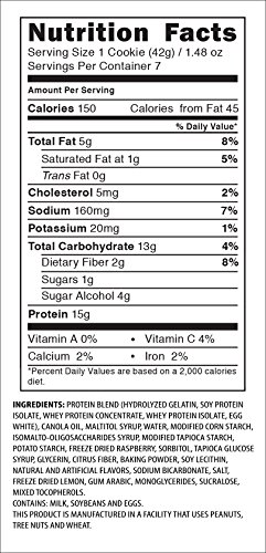 Product Description Cranberry Lemon Cookies A little bit of tang, a little bit of sweet and a whole lot of delight are contained in this high protein cookie. 60 Protein Calories, 1 Fat Serving, 7 Net Carbohydrates 0
