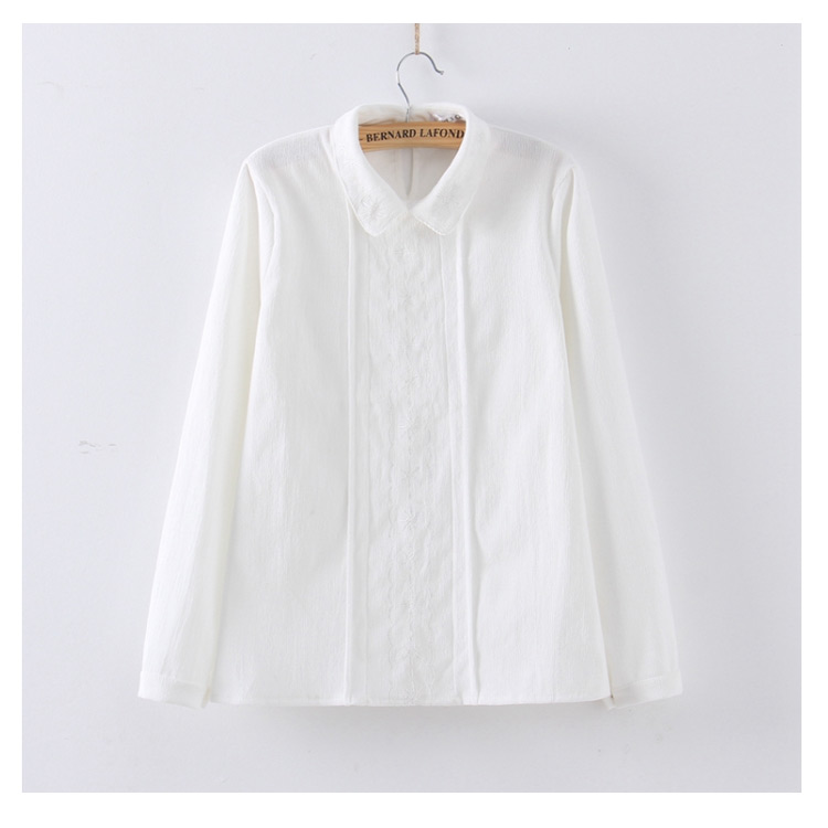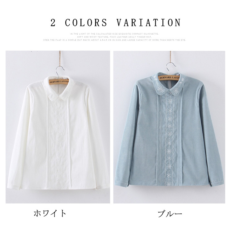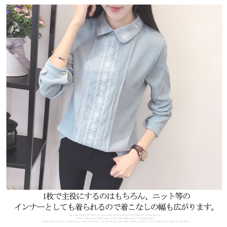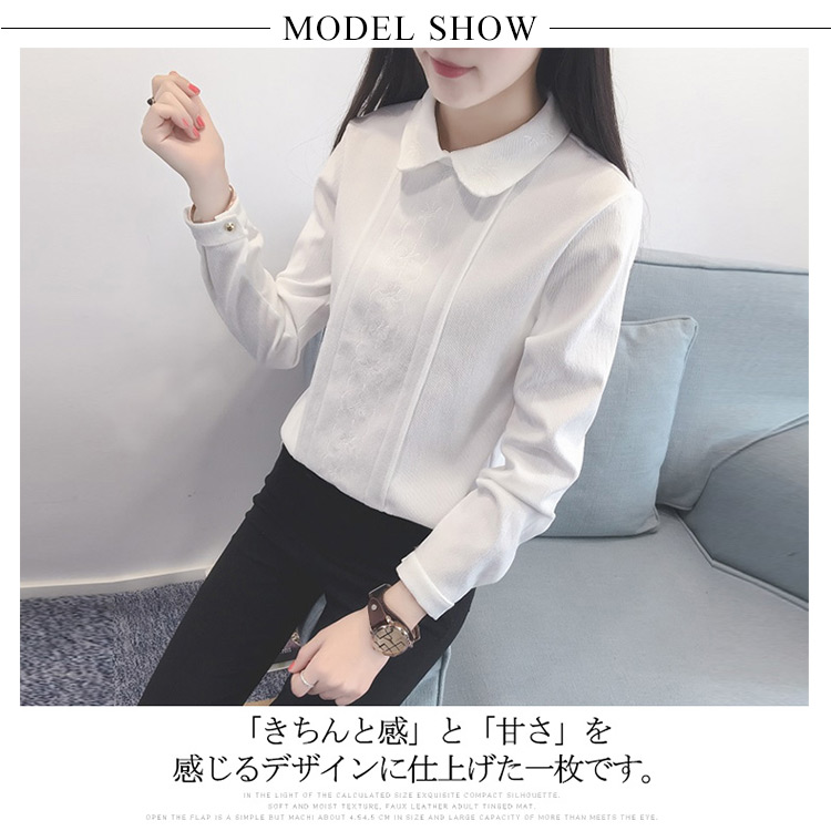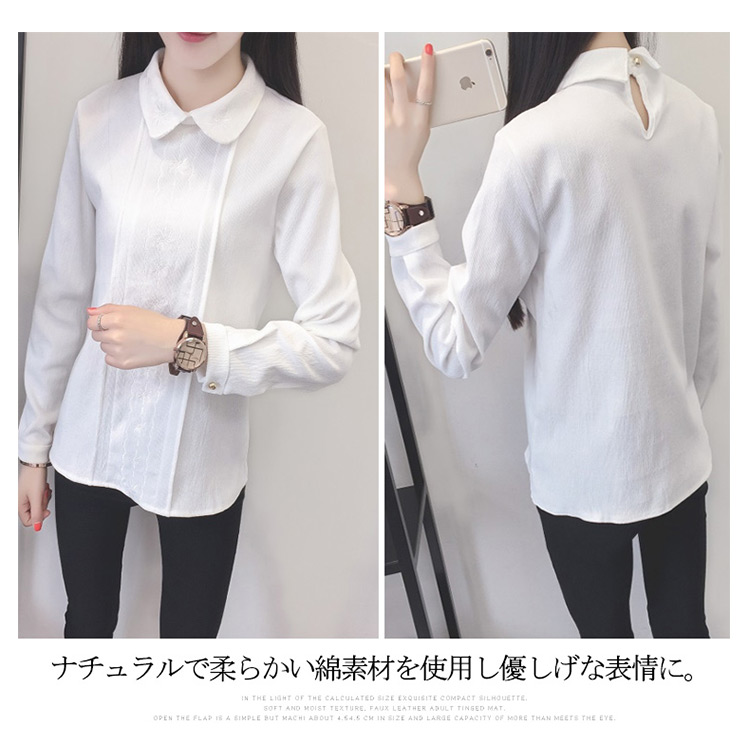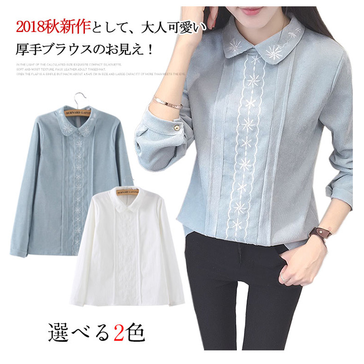 | 2018秋新作として、大人可愛い厚手ブラウスのお見え!「きちんと感」と「甘さ」を感じるデザインに仕上げた一枚です。本体と同色の刺繍入りでおしゃれさも統一感も溢れます。ナチュラルで柔らかい綿素材を使用し優しげな表情に。1枚で主役にするのはもちろん、ニット等のインナーとしても着られるので着こなしの幅も広がります。 | |