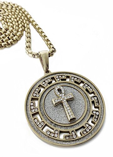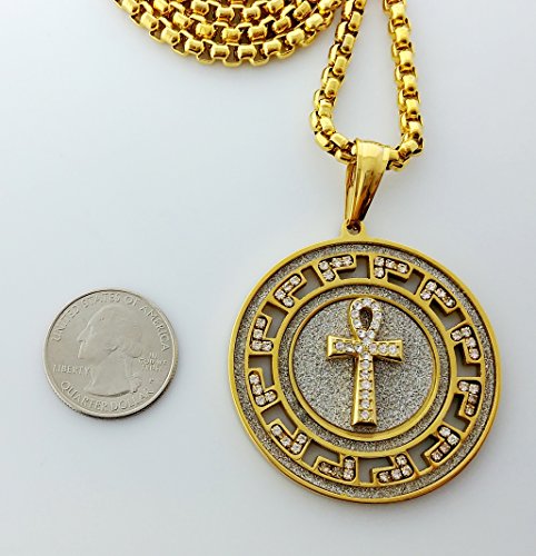 -. Title : Iced Out Medallion Gold Ankh Cross Pendant Stainless Steel Necklace with 30" Chain