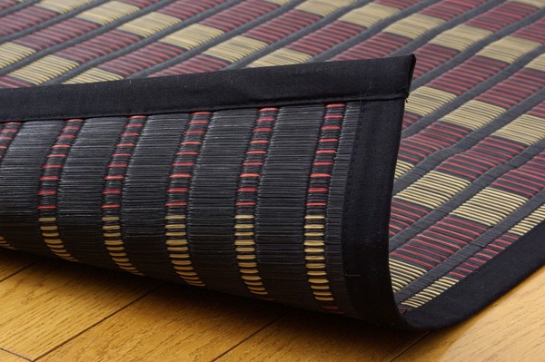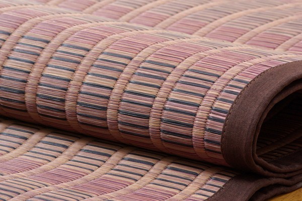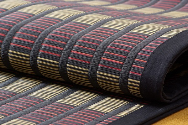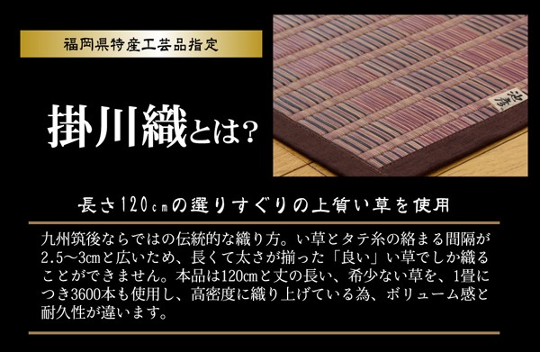 06年福岡県花莚品評会最優秀賞を受賞しました。掛川織は九州筑後地方の伝統的な織り方です。大きな目と小さな目に交互に織り込んだ美しく洗練されたモダンなデザインが人気です。また、厳選された良質の太く長いイ草を高密度に織り込んでいますので丈夫で耐久性があり、しかも素足に心地よいクッション性とボリューム感があります。国産(九州産)のい草を使用しています。一本一本が太く、表皮が厚く繊維がキメ細かいので弾力性があり、耐久性に優れています。い草には空気の自然浄化作用、湿度の調節作用などがあります。また汚れにくく、使用するうちに黄金色に変化し味が出ます。い草に青森ヒバ加工を施しています。(抗菌、防臭効果)