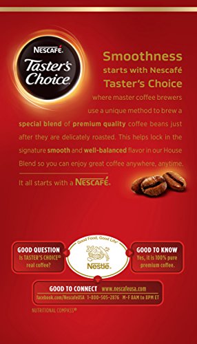 NESCAFE TASTER'S CHOICE House Blend is our signature blend - smooth and mild roasted - made from 100% pure premium coffee beans. Master Coffee Brewers use a unique method to brew our special blend of premium quality coffee beans just after they are delicately roasted. This helps lock in our signature smooth and balanced flavor. Enjoy great coffee anywhere, anytime. It all starts with a NESCAFE.Feature