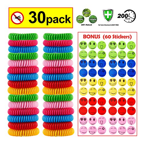 [30 Pack] Mosquito Repellent Bracelet, Monilon Insect Wristband Pest Control Repeller Natural Plant Oil - Non-Toxic DEET-FREE - Bugs Protection up to 8 Days for Kids Adults (60 Mosquito Patches Free)