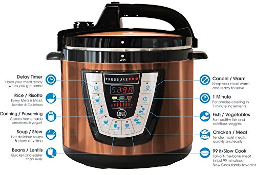 Prepare delicious one-pot meals for your family without spending the whole day in the kitchen with the As Seen on TV Pressure Pro by Harvest Cookware. With a mere touch of a button the Pressure Pro cooks up to ten times faster than conventional methods while locking in flavor and nutrients for amazing and healthy cooking results. The Pressure Pro pressure cooker can be used to prepare fresh or frozen meats, poultry and fish. It's also great for canning fruits, vegetables, and more! (10 quart is the best Pressure Pro model for canning) The Pressure Pro features 10-in-1 Smart Steam Technology, Multi-function (high pressure/low pressure/rice cooker), One-touch Pre-Program Buttons, Non-Stick FDA Grade Inner Pot, Stainless Steel Safe Lock Lid, Digital Brain Display Panel, Automatic Keep Warm Mode, Delay Timer, Flavor Infusion Technology, Built-in Safety Features, Choose From 4 Sizes, Dishwasher Safe, 99-It Cooking feature, 60-Day Money Back.Feature