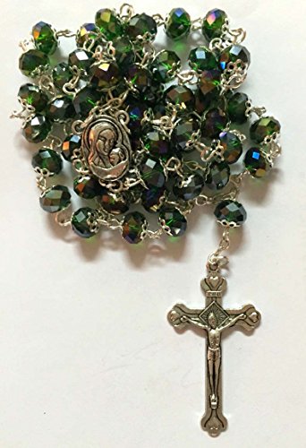 [Product Information]- Green Crystal Beads Rosary With Metal Crucifix Long Beaded Necklace With Madonna Medallion In The Middle And Holy Soil From Jerusalem Holy Land.